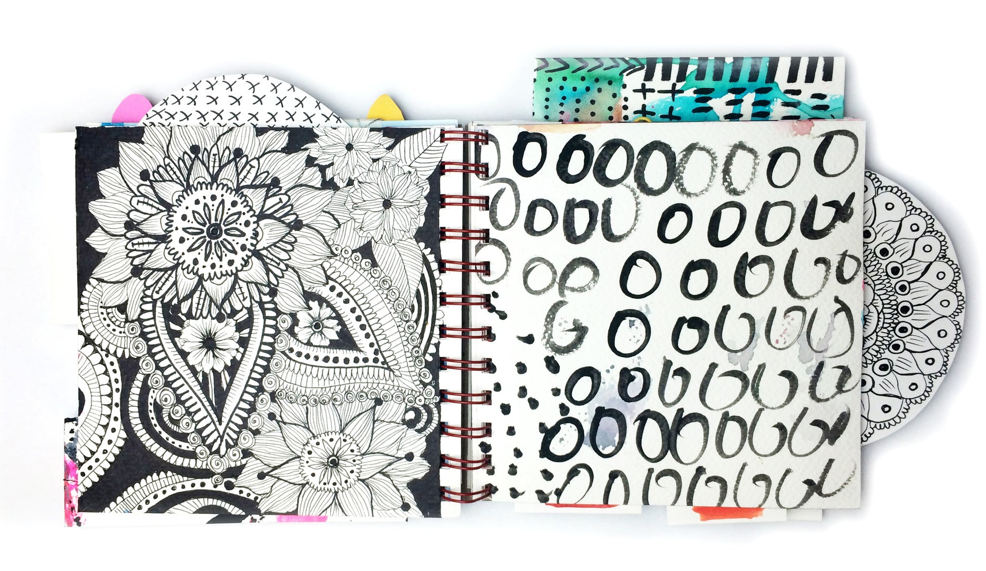 I spend  A LOT of time sketching but I probably spend just as much time working in an art journal. For me there is really a fine line between an art journal and a sketchbook. For my sketching process I limit my supplies- But when I work in my art journal, I explore all kinds of mixed media techniques like painting, collage, sewing (with paper), stamping, doodling, drawing and printmaking. My art journal is a small and accessible place for me to practice, explore and brainstorm all kinds of techniques.Â