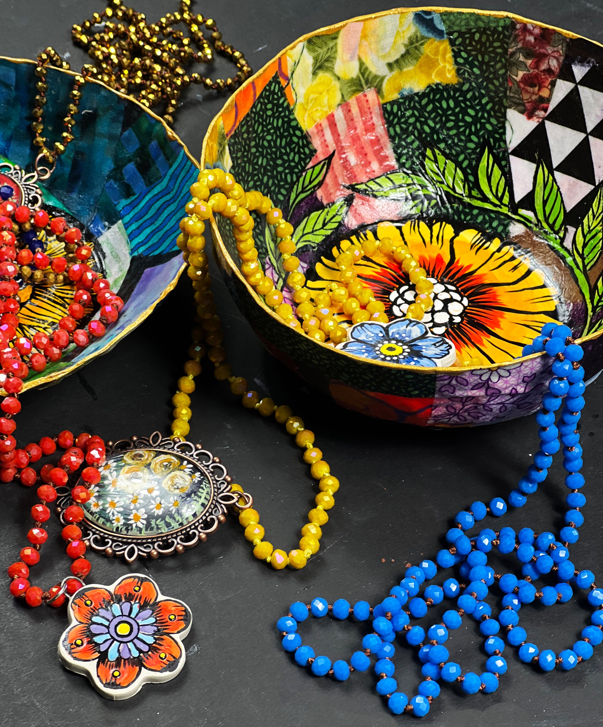 Handmade fabric bowls crafted from Alisaβs studio scraps- an ongoing creative mission to give new life to leftover materials rather than let them go to waste. Each bowl is layered with vibrant colors and textures and finished with a hand painted flower and completely one-of-a-kind.