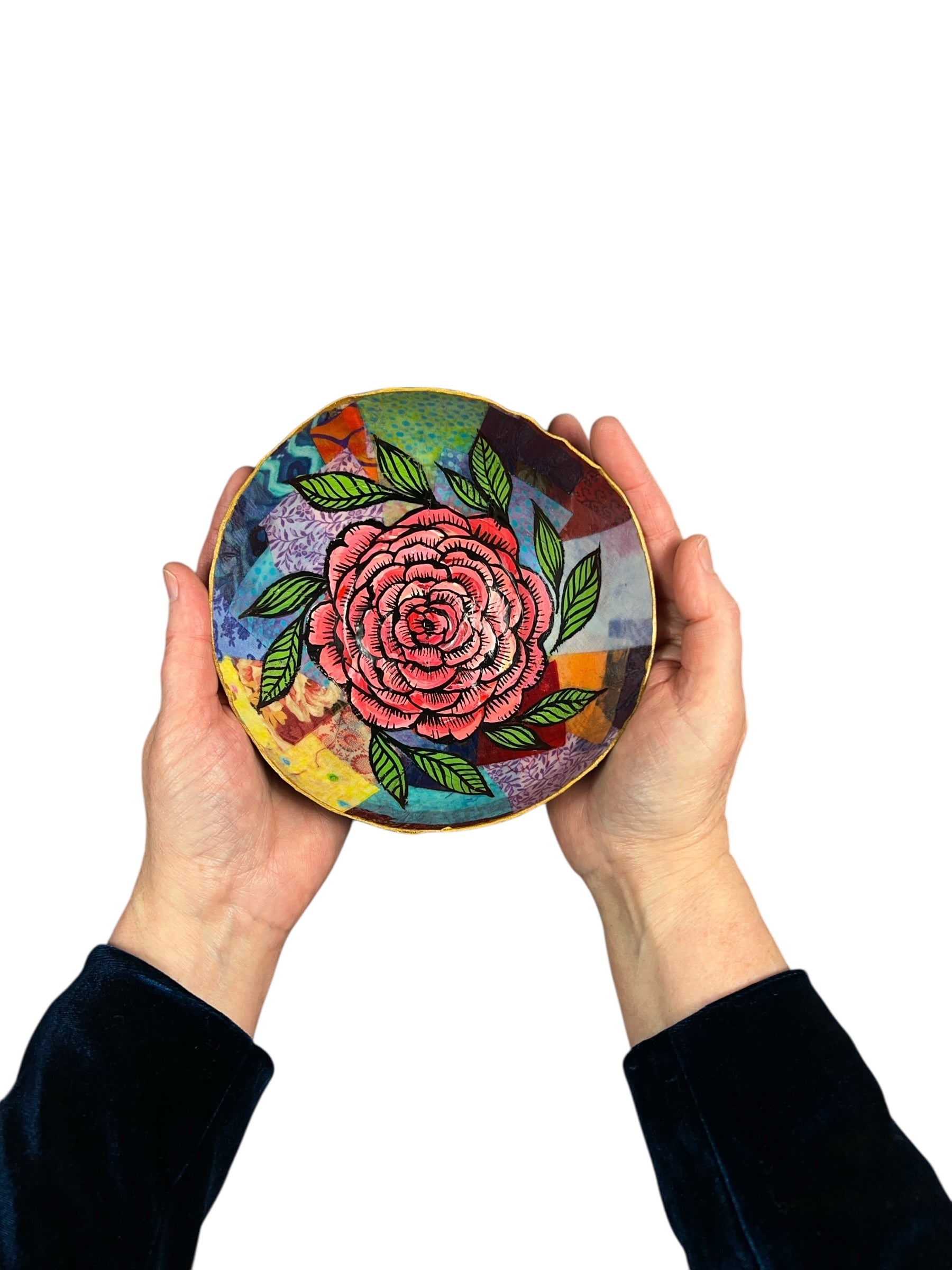 Handmade fabric bowls crafted from Alisaβs studio scraps- an ongoing creative mission to give new life to leftover materials rather than let them go to waste. Each bowl is layered with vibrant colors and textures and finished with a hand painted flower and completely one-of-a-kind.