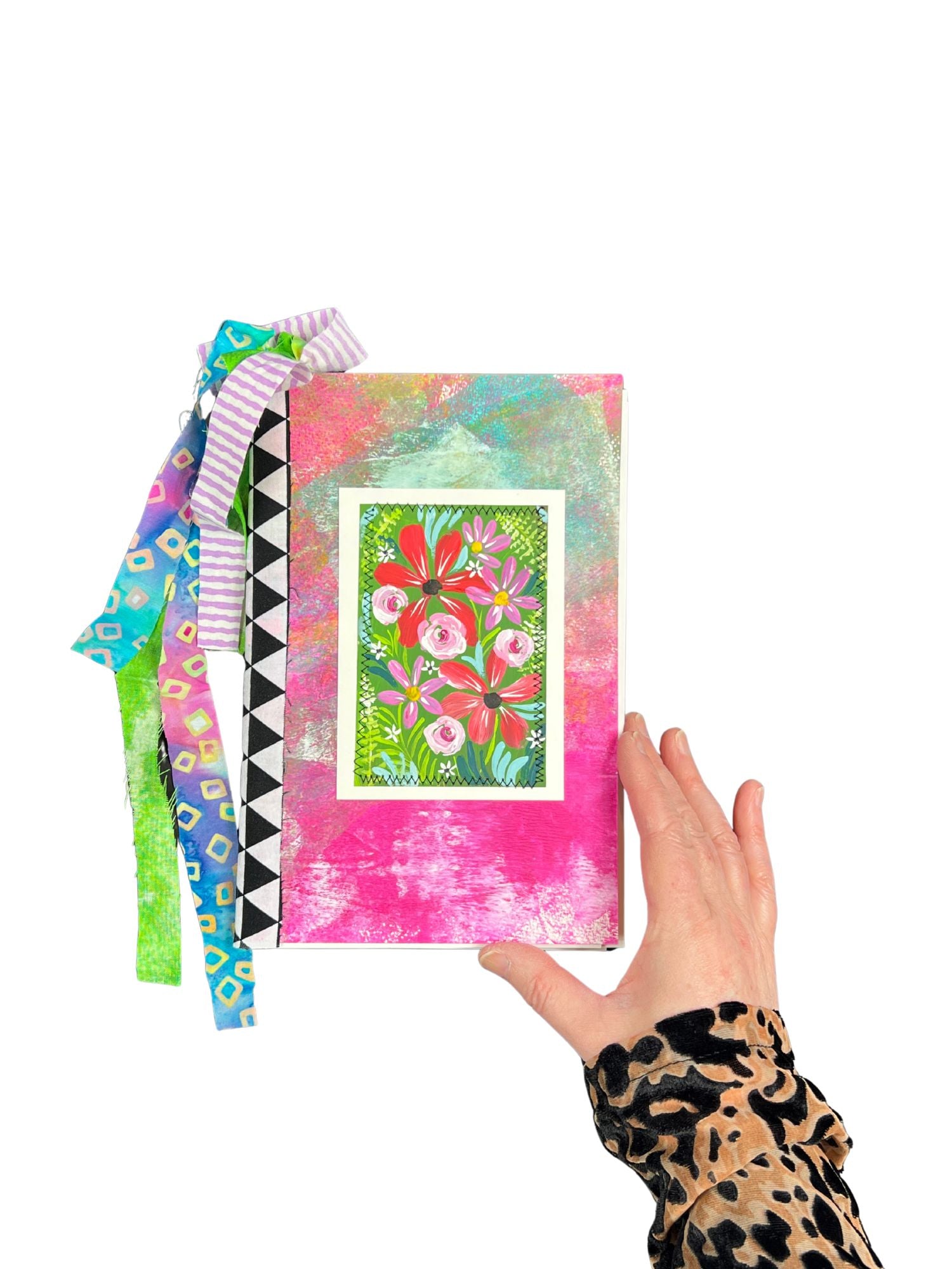 6 x 9" handmade journal featuring a hand-painted cover and 12–15 pages filled with unique bits and pieces of paper, ready for layers of creativity. Each junk journal is crafted from scraps, hand-dyed papers, and a variety of Alisa’s studio leftovers, making every one truly one-of-a-kind!