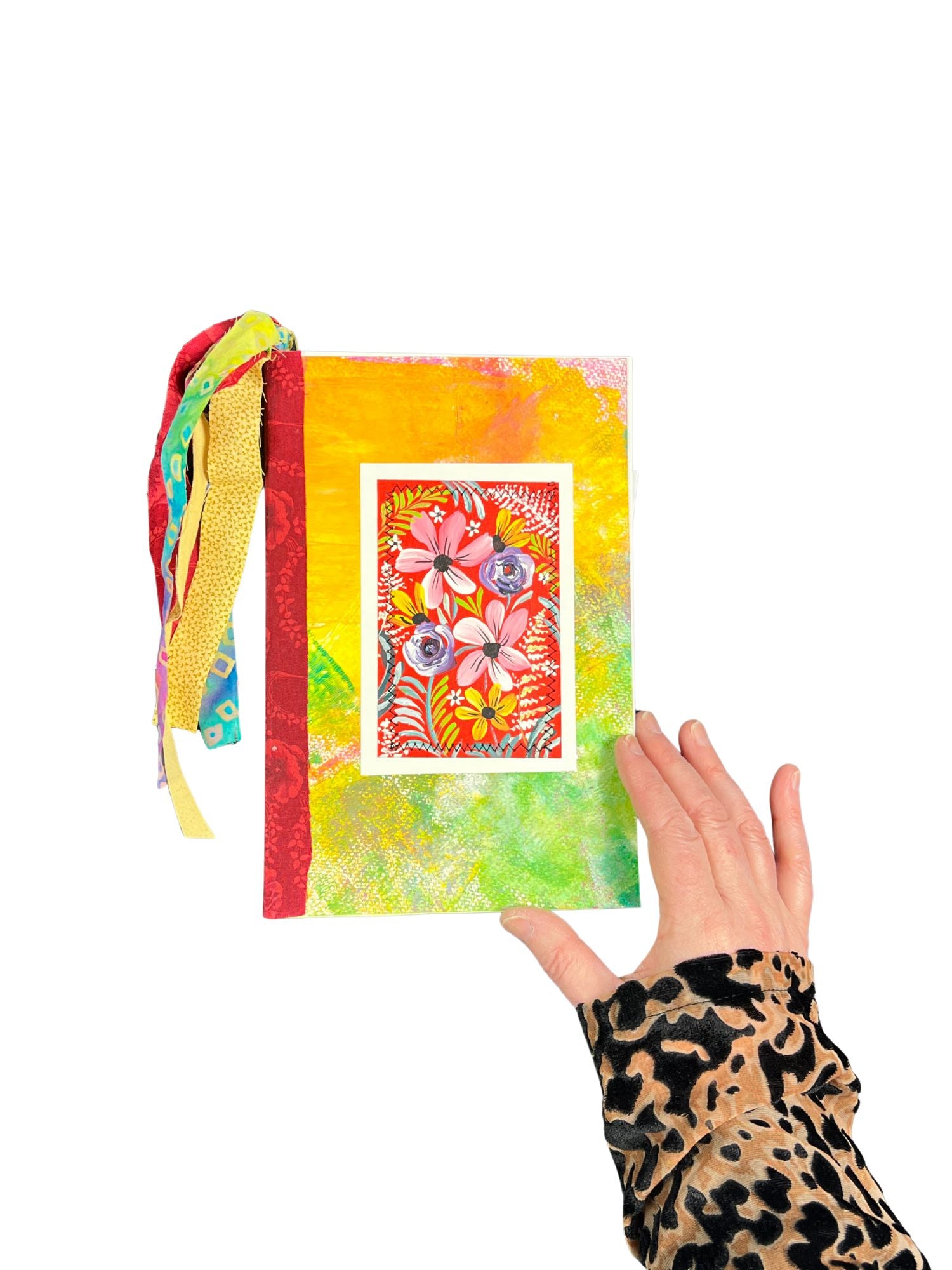 6 x 9" handmade journal featuring a hand-painted cover and 12–15 pages filled with unique bits and pieces of paper, ready for layers of creativity. Each junk journal is crafted from scraps, hand-dyed papers, and a variety of Alisa’s studio leftovers, making every one truly one-of-a-kind!