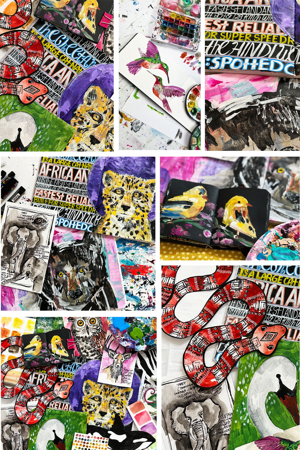 In this class we will be using drawing, painting and a variety of mixed media techniques to explore all kinds of animals and creatures. Through video, photos and prompts we will use our art journals as a place document, play and experiment with animal themes.