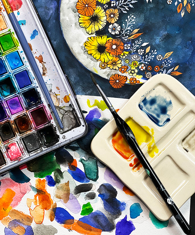 A fun little class with 5 lessons where we explore creating watercolor and sketch floral moons!
